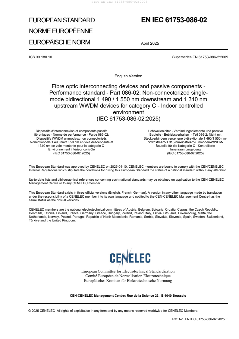 Keywords: EN IEC 61753-086-02:2025, WWDM, PON, 1490/1550 nm, 1310 nm, fibre optic, non-connectorized, performance standard, category C, indoor controlled environment.