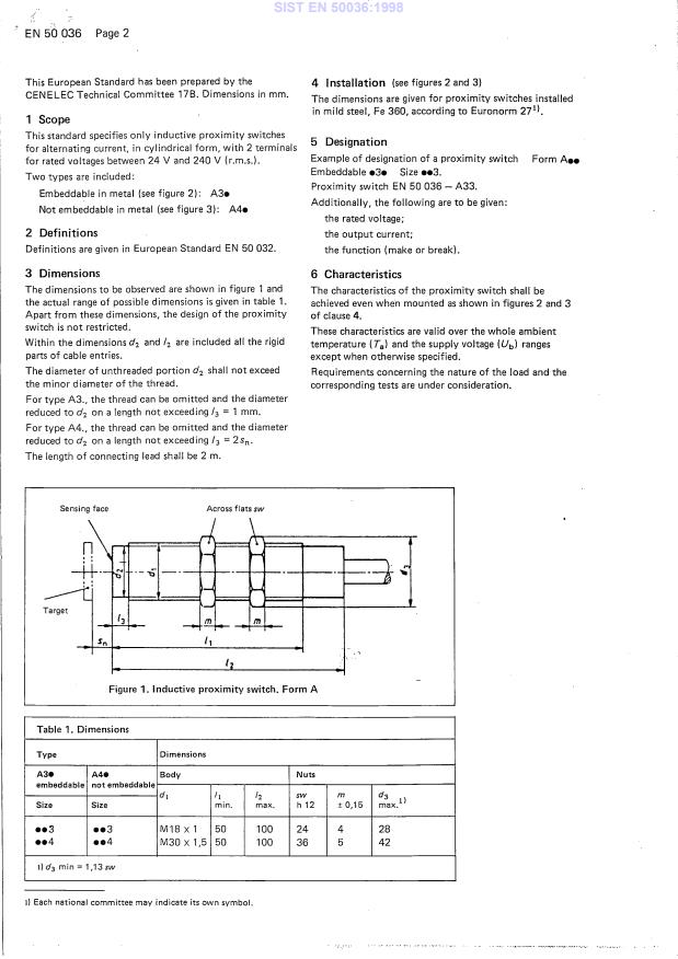 EN 50036:1988 is a standard published by CLC. Its full title is "Low-voltage switchgear and controlgear for industrial use - Inductive proximity switches - Form A, for alternating current, 2 terminals". This standard covers: D100/022: EN withdrawn