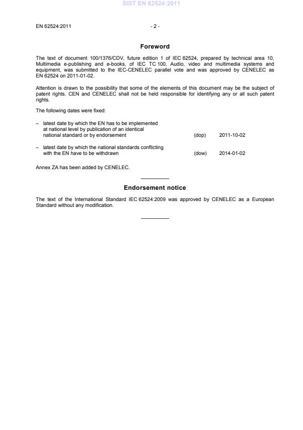 EN 62524:2011 is a standard published by CLC. Its full title is "Multimedia systems and equipment - Multimedia e-publishing and e-books - Reader's format for e-publishing". This standard covers: IEC 62524:2009 specifies a reader's format for multimedia e-publishing employed for e-book data interchange among publishers and readers, satisfying a number of readers' requirements such as being non-revisable, equipment-adaptive and application-adaptive.