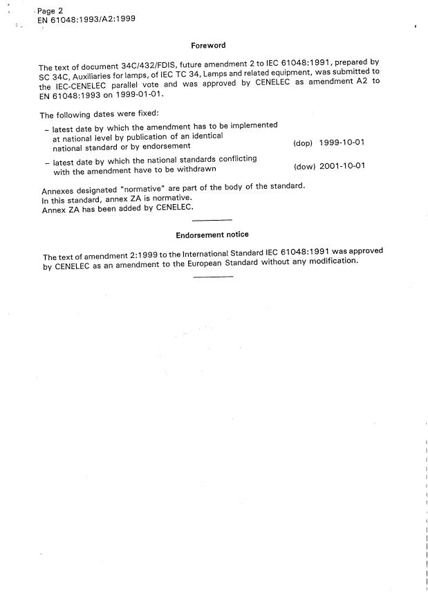 EN 61048:1993/A2:1999 is a amendment published by CLC. Its full title is "Auxiliaries for lamps - Capacitors for use in tubular fluorescent and other discharge lamp circuits - General and safety requirements". This standard covers: EN following parallel vote