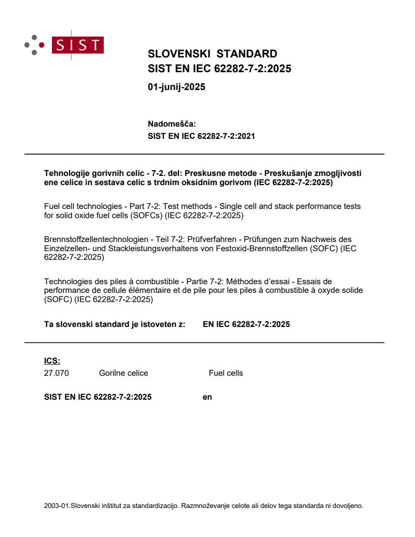 Keywords: EN IEC 62282-7-2:2025, SOFC, solid oxide fuel cells, test methods, single cell, stack performance, durability testing, I–V characteristics, fuel utilization.