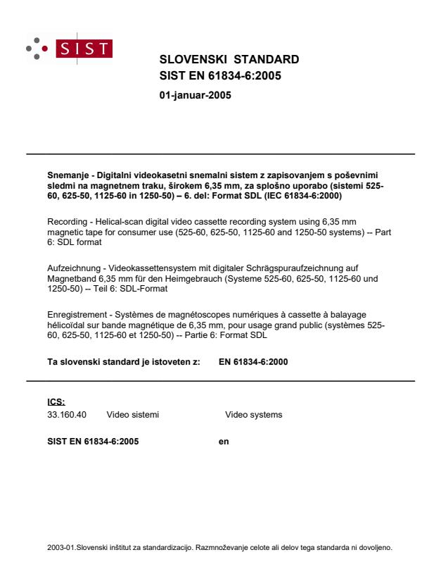 Snemanje - Digitalni videokasetni snemalni sistem z zapisovanjem s poševnimi sledmi na magnetnem traku, širokem 6,35 mm, za splošno uporabo (sistemi 525-60, 625-50, 1125-60 in 1250-50) – 6. del: Format SDL (IEC 61834-6:2000)