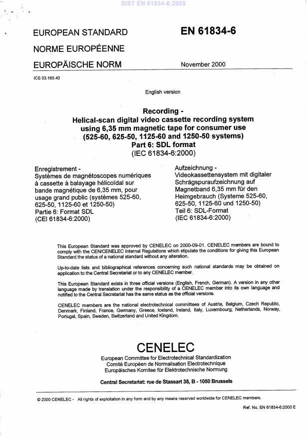 EN 61834-6:2000 is a standard published by CLC. Its full title is "Recording - Helical-scan digital video cassette recording system using 6,35 mm magnetic tape for consumer use (525-60, 625-50, 1125-60 and 1250-50 systems) - Part 6: SDL format". This standard covers: Describes the format extension, using higher compression to increase recording time and reduce running costs for the digital video cassette recording system.