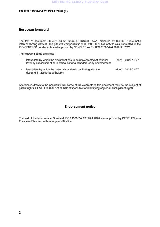 This amendment A1 modifies the European Standard EN IEC 61300-2-4:2019; it was approved by CENELEC on 2020-02-27. CENELEC