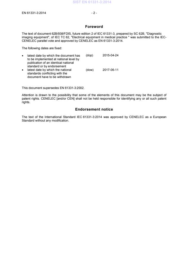 EN 61331-3:2014 (CLC adoption of IEC 61331-3:2014) specifies requirements for protective clothing, eyewear and patient shields used to protect people from diagnostic medical X‑radiation up to 150 kV. It covers general requirements for accompanying documents, design, materials, sizing, minimum attenuation properties, marking and standardized statements of compliance. This edition updates and replaces the 1998/2002 edition and adds coverage for thyroid collars, protective eyewear and protective aprons for dental use, and requires an improved method for determining attenuation across a broader, clinically relevant range of radiation qualities.