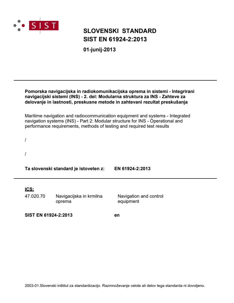 V tem delu standarda IEC 61924 so opredeljene minimalne zahteve za načrtovanje, izdelavo, integracijo, preskusne metode in zahtevane rezultate preskušanja za integrirane navigacijske sisteme (INS), da so skladni z zahtevami Mednarodne pomorske organizacije (IMO) iz Resolucije MSC.252(83). Poleg tega je upoštevana Resolucija Mednarodne pomorske organizacije A.694(17), s katero je povezan standard IEC 60945. Če se zahteva iz tega standarda razlikuje od zahteve iz standarda IEC 60945, velja zahteva iz tega standarda.