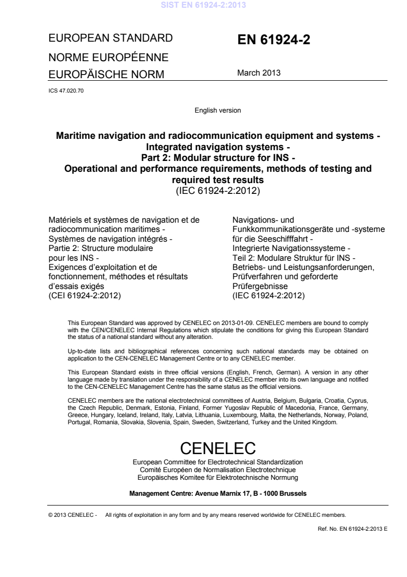EN 61924-2:2013 is a standard published by CLC. Its full title is "Maritime navigation and radiocommunication equipment and systems - Integrated navigation systems - Part 2: Modular structure for INS - Operational and performance requirements, methods of testing and required test results". This standard covers: IEC 61924-2:2012(E) specifies the minimum requirements for the design, manufacture, integration, methods of testing and required test results for an integrated navigation system (INS) to comply with the International Maritime Organization (IMO) requirements of Resolution MSC.252(83). In addition, it takes account of IMO Resolution A.694(17) to which IEC 60945 is associated. When a requirement in this standard is different from IEC 60945, the requirement of this standard takes precedence.