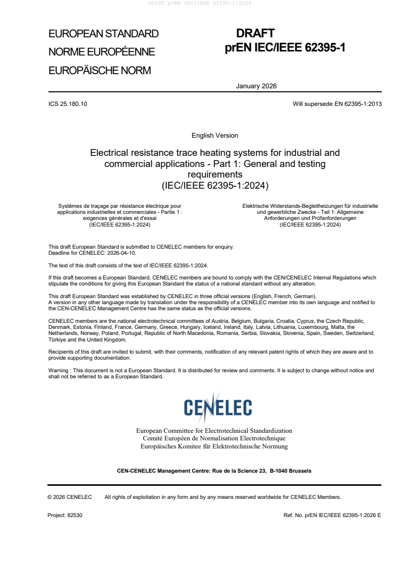 prEN IEC/IEEE 62395-1:2026 is a draft published by CLC. Its full title is "Electrical resistance trace heating systems for industrial and commercial applications - Part 1: General and testing requirements". This standard covers: IEC/IEEE 62395-1:2024 specifies requirements for electrical resistance trace heating systems and includes general test requirements. This first edition cancels and replaces the second edition published in 2013. This edition constitutes a technical revision. This edition includes the following significant technical changes, apart from general revisions of IEC 62395-1 and harmonization with IEEE 515 [1] and IEEE 515.1 [2], with respect to the previous edition: a) Added control and monitoring requirements for fire sprinkler systems and safety showers. b) Provided a supplemental ice bath method for verification of rated output. c) Provided constructional and type test requirements for glands used to terminate heating devices to an exposed enclosure.