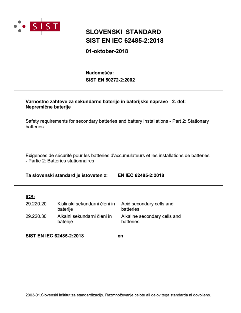 Varnostne zahteve za sekundarne baterije in baterijske naprave - 2. del: Nepremične baterije