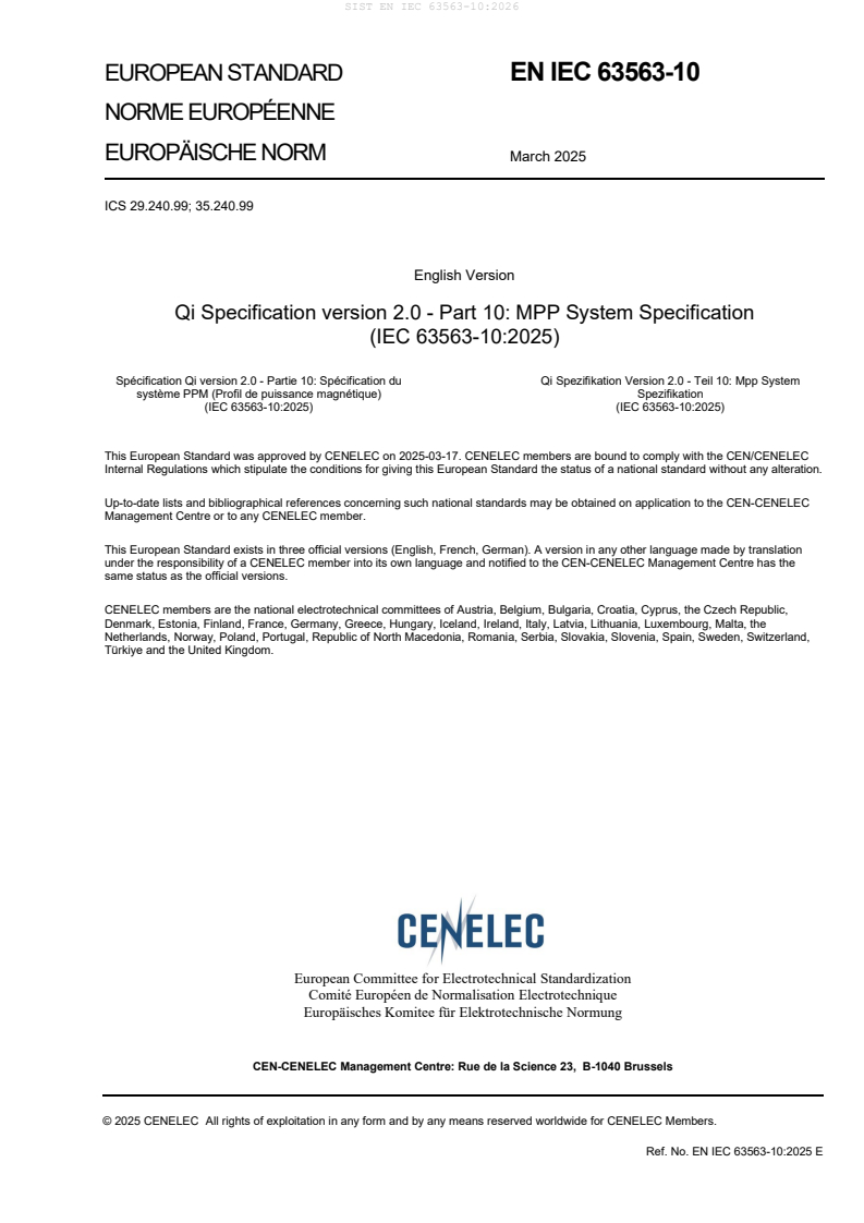 EN IEC 63563-10:2025 - Qi Specification version 2.0, Part 10: MPP (Magnetic Power Profile) System Specification - is a CLC-adopted standard that formalizes the MPP extension to Qi v1.3 Baseline Power Profile (BPP). It defines how manufacturers can implement interoperable power transmitters (PTx) and power receivers (PRx) using the MPP system, covering architectural models, coil specifications, power delivery behavior, communication physical layers, authentication, and safety-related functions such as foreign-object detection (FOD).