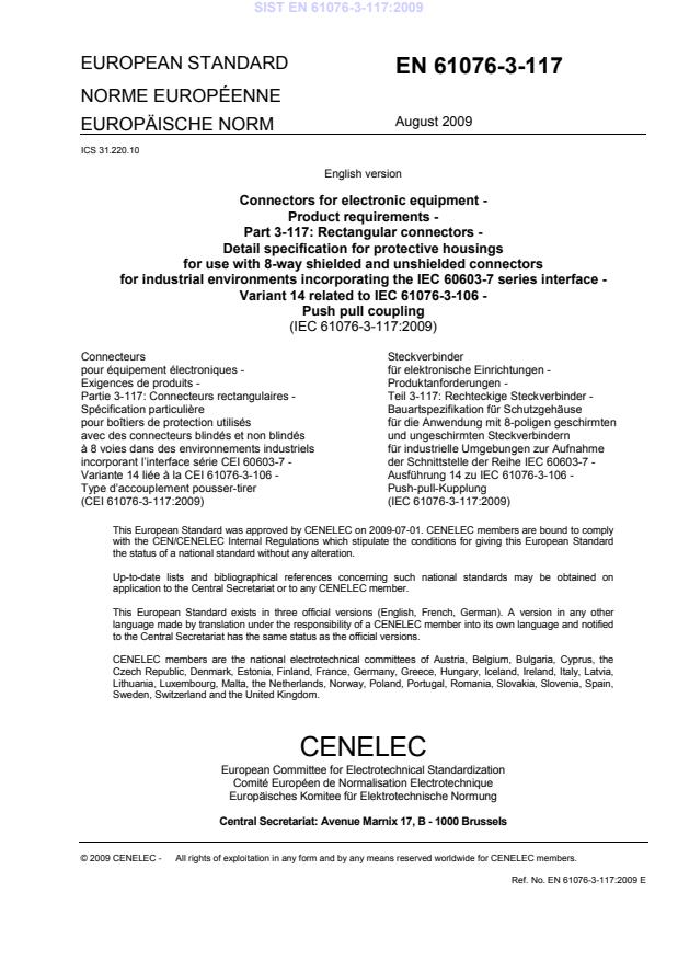 8) Attention is drawn to the Normative references cited in this publication. Use of the referenced publications is indispensable for the correct application of this publication. 9) Attention is drawn to the possibility that some of the elements of this IEC Publication may be the subject of patent rights. IEC shall not be held responsible for identifying any or all such patent rights. International Standard IEC 61076-3-117 has been prepared by subcommittee 48B: Connectors, of IEC technical committee 48: Electromechanical components and mechanical structures for electronic equipment. This International Standard cancels and replaces IEC/PAS 61076-3-117 (2006). SIST EN 61076-3-117:2009
