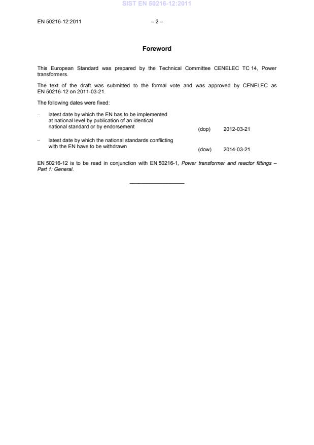 EN 50216-12 is to be read in conjunction with EN 50216-1, Power transformer and reactor fittings –