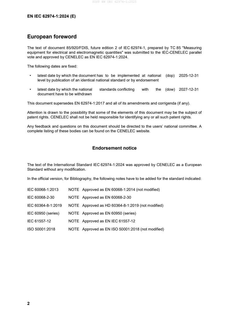 EN IEC 62974-1:2024 has the following relationships with other standards: It is inter standard links to EN 62974-1:2017, EN 60068-2-2:2007, EN IEC 62052-11:2021, EN 61010-1:2010, EN 61000-4-4:2012, EN IEC 61000-4-11:2020, EN 60068-2-1:2007, EN 60529:1991/A2:2013, EN 62262:2002, EN 61010-1:2010/A1:2019, EN 60529:1991/A1:2000, EN 60068-2-6:2008, EN 62262:2002/A1:2021, EN 60068-2-78:2013, EN 60529:1991. Understanding these relationships helps ensure you are using the most current and applicable version of the standard.