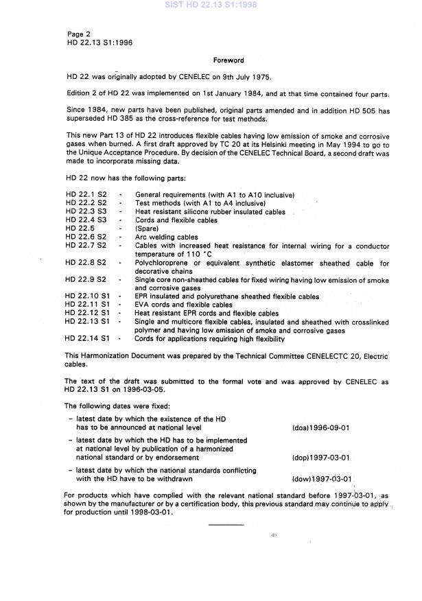 HD 22.13 S1:1996 is a standardization document published by CLC. Its full title is "Rubber insulated cables of rated voltages up to and including 450/750 V - Part 13: Single and multicore flexible cables, insulated and sheathed with crosslinked polymer and having low emission of smoke and corrosive gases". This standard covers: This part (Part 13) of the HD details the particular specifications for single and multicore flexible cables of rated voltage 450/750 volts, insulated and sheathed with cross-linked compound having low emission of smoke and corrosive gases when they are involved in a fire. All non-metallic materials in this part of this HD, must comply with requirements of HD 602. All cables shall comply with the appropriate requirements given in Part 1 of this HD and the individual types of cable shall each comply with the particular requirements of this Part. NOTE: The overall dimensions of the cables in this part of HD 22 have been calculated in accordance with EN 60719.