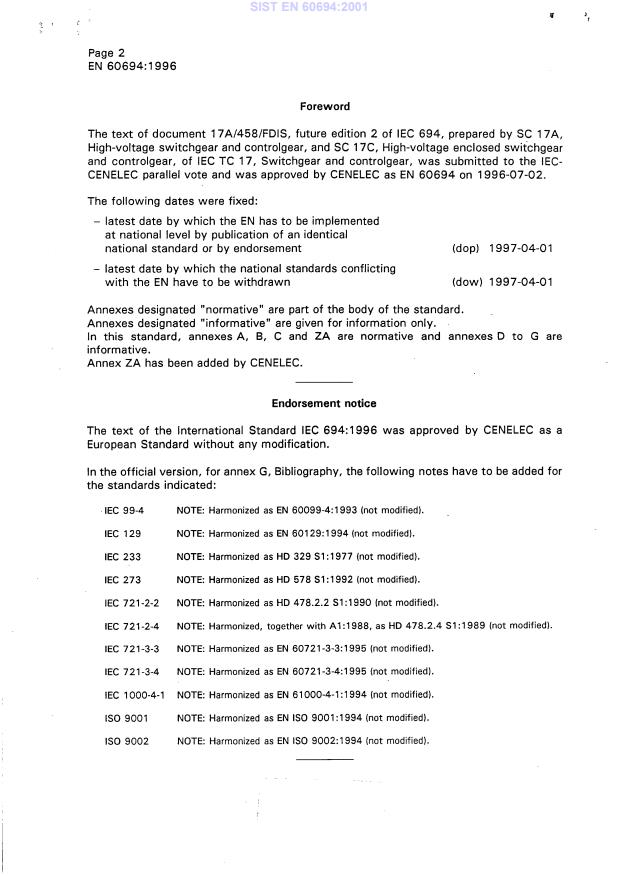 EN 60694:1996/A2:2001 - Common specifications for high-voltage switchgear and controlgear standards - Effective Date