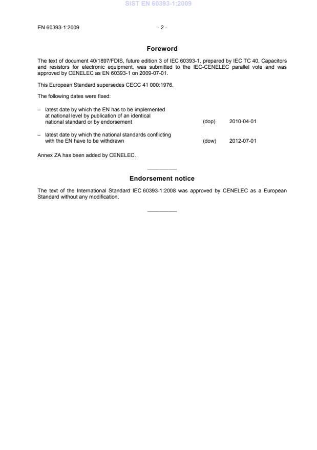 Foreword The text of document 40/1897/FDIS, future edition 3 of IEC 60393-1, prepared by IEC TC 40, Capacitors and resistors for electronic equipment, was submitted to the IEC-CENELEC parallel vote and was approved by CENELEC as EN 60393-1 on 2009-07-01. This European Standard supersedes CECC 41 000:1976. The following dates were fixed: – latest date by which the EN has to be implemented