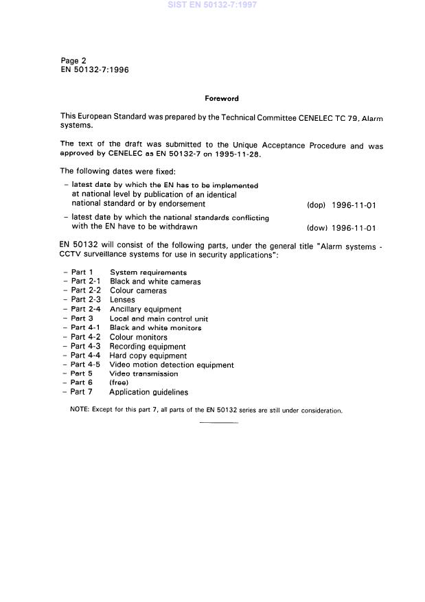 EN 50132-7:1996 is a standard published by CLC. Its full title is "Alarm systems - CCTV surveillance systems for use in security applications - Part 7: Application guidelines". This standard covers: This standard gives recommendations for the selection, planning and installation of closed circuit television systems comprising of camera(s) with monitor(s) and/or video recorder(s), switching, control and ancillary equipment for use in security applications. The objectives of this standard are: to provide a framework to assist customers, installers and users in establishing their requirements; to assist specifiers and users in determining the appropriate equipment required for a given application; to provide means of evaluating objectively the performance of an installed system