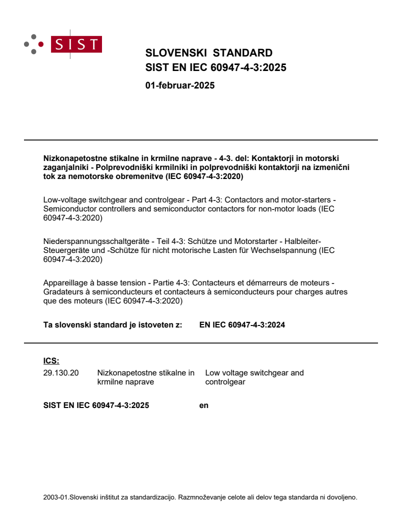 Nizkonapetostne stikalne in krmilne naprave - 4-3. del: Kontaktorji in motorski zaganjalniki - Polprevodniški krmilniki in polprevodniški kontaktorji na izmenični tok za nemotorske obremenitve (IEC 60947-4-3:2020)