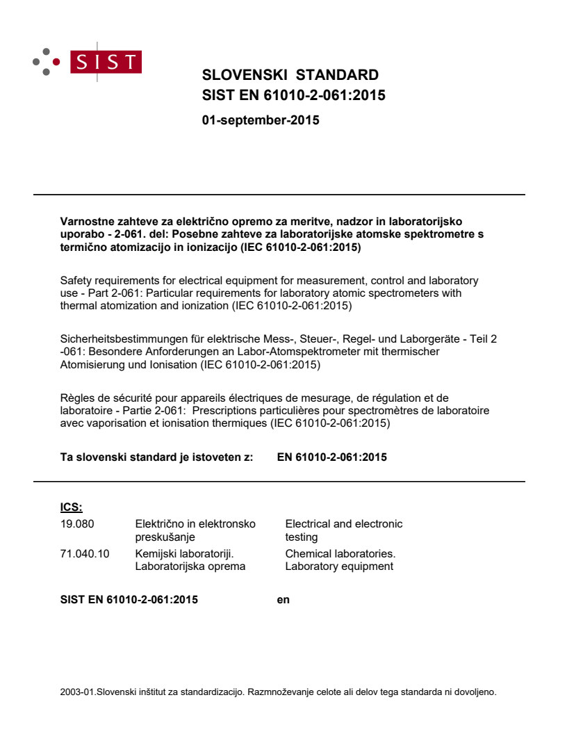 Varnostne zahteve za električno opremo za meritve, nadzor in laboratorijsko uporabo - 2-061. del: Posebne zahteve za laboratorijske atomske spektrometre s termično atomizacijo in ionizacijo (IEC 61010-2-061:2015)