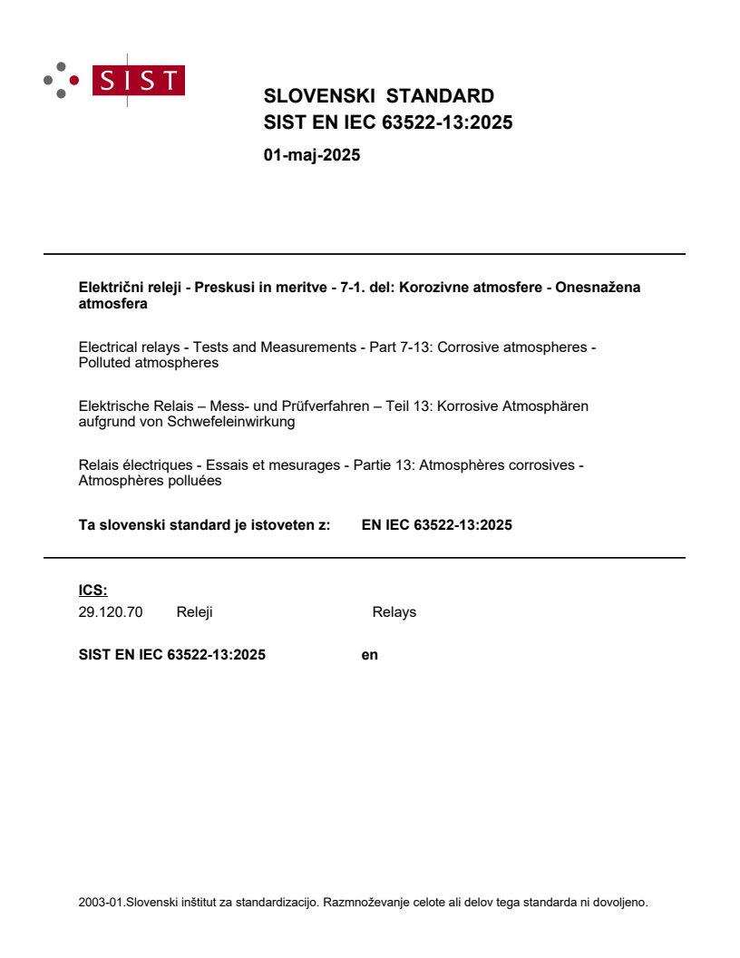 Standard IEC 63522-13:2024 se uporablja za preskušanje elektromehanskih osnovnih relejev (elektromehanskih relejev, relejev reed, kontaktov reed, stikal reed in njihovih tehnoloških kombinacij) in ocenjevanje njihove zmožnosti delovanja v pričakovanih pogojih med transportom in skladiščenjem ter v vseh vidikih operativne uporabe. Ta dokument določa standardno preskusno metodo, s katero se simulirajo vplivi žveplenih atmosfer na releje. Preskusni pogoji simulirajo umetno ustvarjeno situacijo in omogočajo primerjavo zmogljivosti in uporabnosti preskušanih naprav (DUT) glede na znane in obstoječ rešitv preklapljanja. Gre za statični preskus brez dejanskega delovanja preskušane naprave, s katerim se simulira največja možna korozija (korozija se namreč s časom povečuje). Korozivna plast lahko povzroči lepljenje kontaktov, poveča upornost ali sproži druge neželene učinke v releju. Na te vidike lahko vpliva aktiviranje preskušane naprave med preskusom, zaradi česar se lahko uničijo korozivne plasti ali prikrijejo pomembni dolgoročni učinki. Poleg onesnaženih atmosfer je mogoče primernost preskušane naprave za uporabo in/ali skladiščenje v korozivnih atmosferah oceniti tudi v atmosferi, nasičeni s soljo, kot je opisano v standardu IEC 63522-44.
