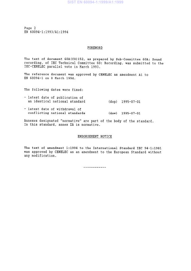 EN 60094-1:1993/A1:1994 is a amendment published by CLC. Its full title is "Magnetic tape sound recording and reproducing systems - Part 1: General conditions and requirements". This standard covers: EN following parallel vote