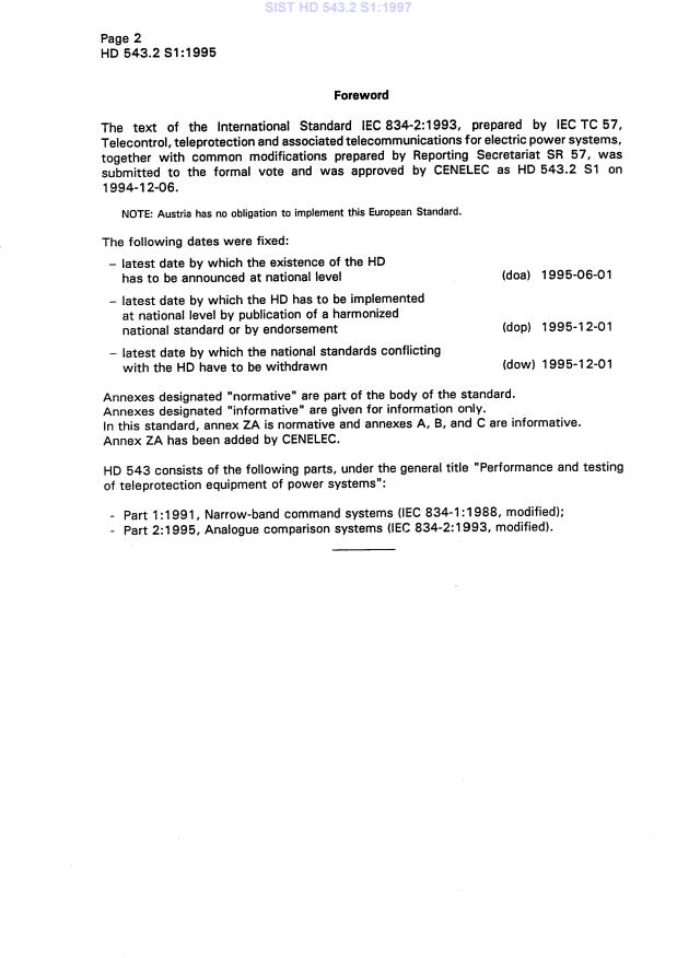HD 543.2 S1:1995 (CLC) - adopted as SIST HD 543.2 S1:1997 - specifies the performance and testing of teleprotection equipment of power systems for analogue comparison systems. The standard applies to both narrowband and wideband teleprotection systems that convey analogue information about primary quantities such as phase or phase and amplitude. It is catalogued under ICS 25.040.40 (industrial process measurement and control).