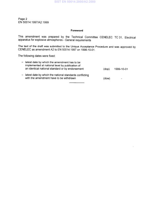 EN 50014:1997/A2:1999 is a amendment published by CLC. Its full title is "Electrical apparatus for potentially explosive atmospheres - General requirements". This standard covers: No dow (transition ruled by Directive 94/9/EC) * Superseded by EN 60079-0:2004