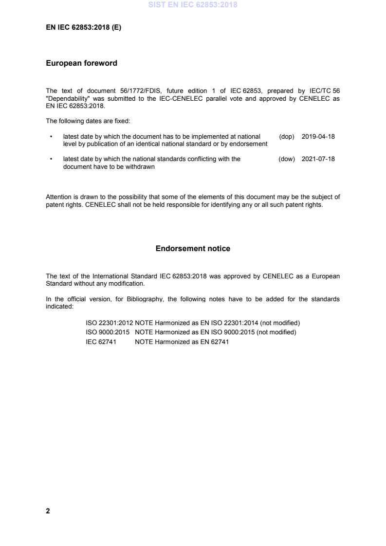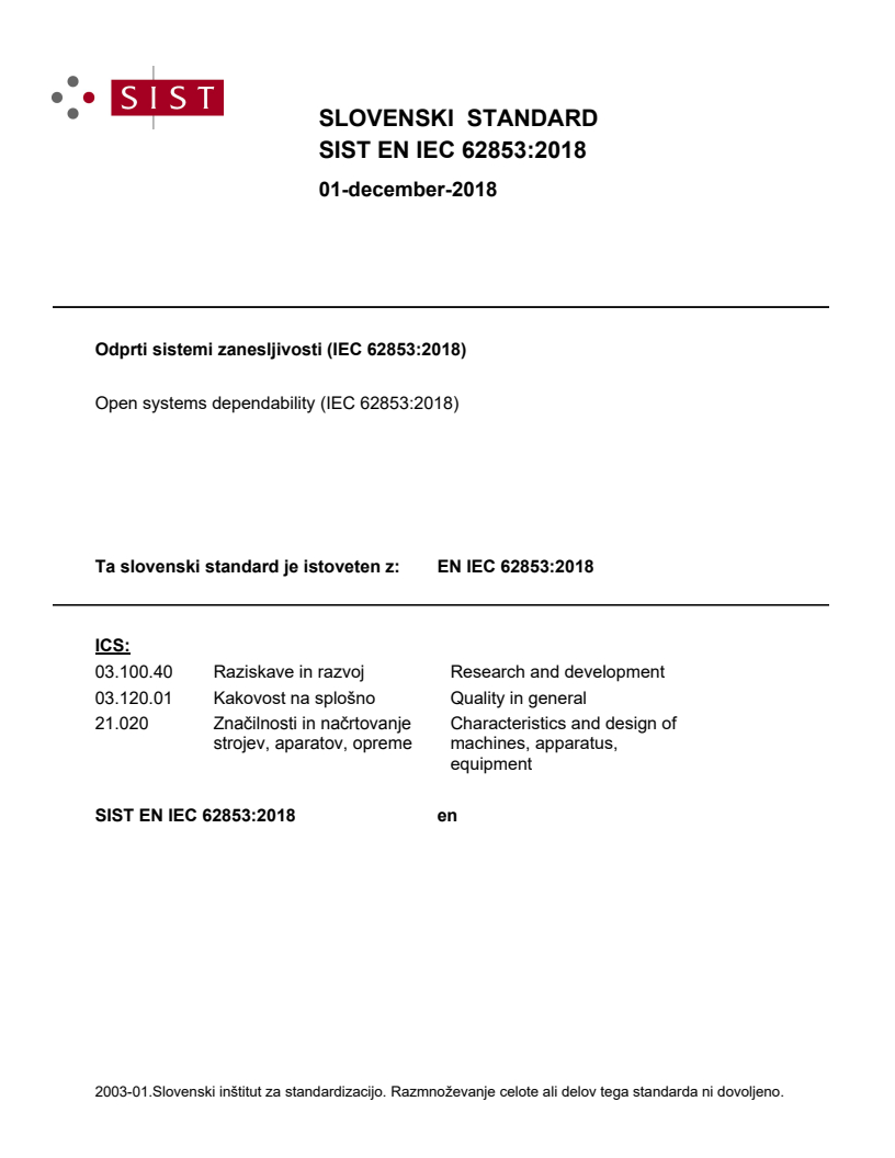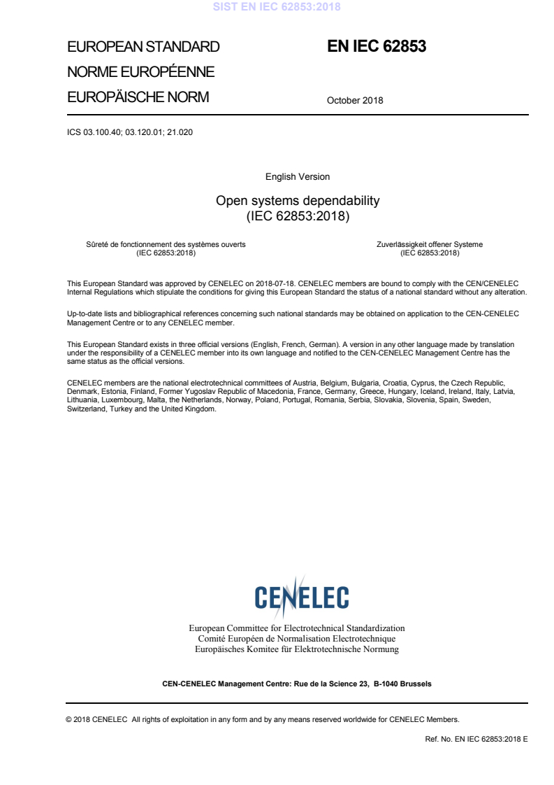 Keywords: EN IEC 62853:2018, Open systems dependability, dependability of open systems, system life cycle, dependability assessment, failure response, change accommodation.