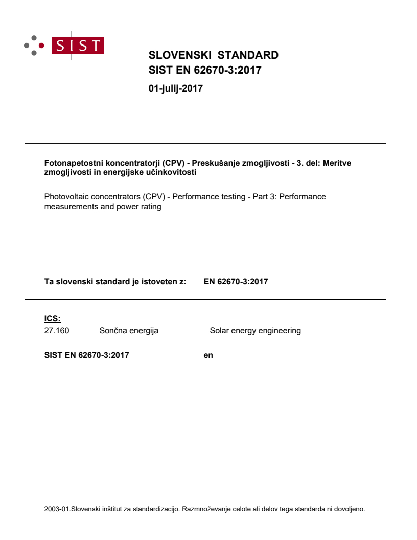 EN 62670-3:2017 (identical to IEC 62670-3:2017) specifies measurement procedures and instrumentation for determining the performance and power rating of concentrator photovoltaic (CPV) devices. The standard defines how to measure CPV performance at the Concentrator Standard Operating Conditions (CSOC) and Concentrator Standard Test Conditions (CSTC) (see IEC 62670-1 for definitions), and how to translate measured data into rated output (power rating).
