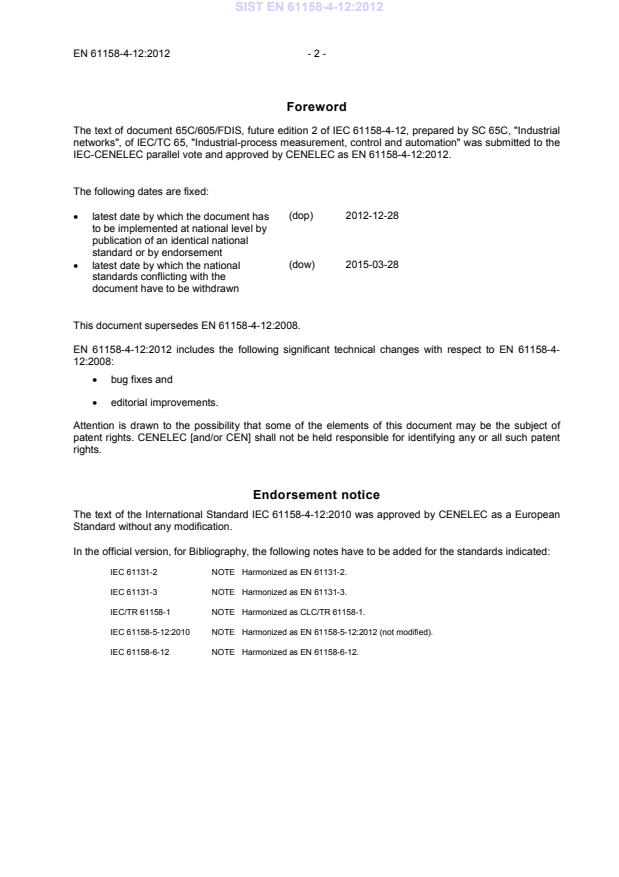 Foreword The text of document 65C/605/FDIS, future edition 2 of IEC 61158-4-12, prepared by SC 65C, "Industrial networks", of IEC/TC 65, "Industrial-process measurement, control and automation" was submitted to the IEC-CENELEC parallel vote and approved by CENELEC as EN 61158-4-12:2012.