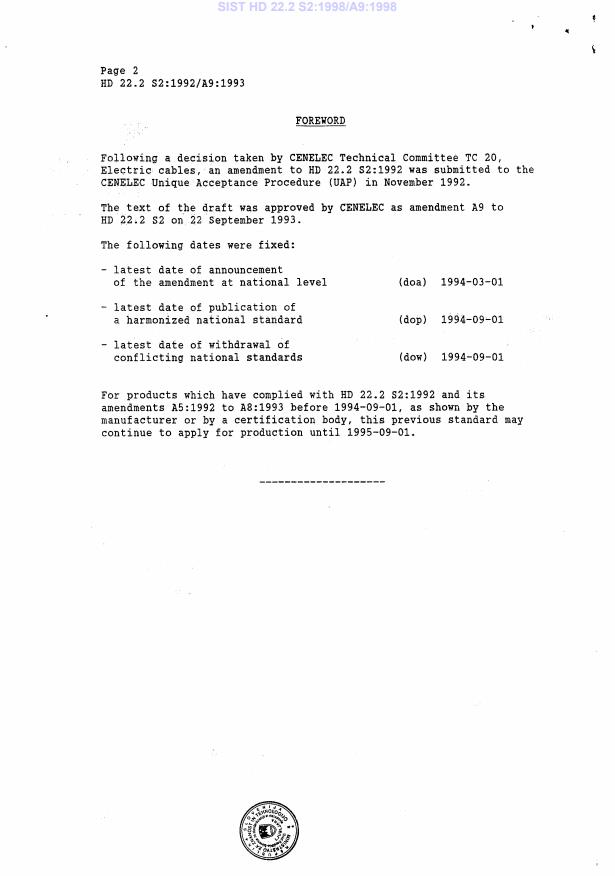 HD 22.2 S2:1992/A9:1993 is a amendment published by CLC. Its full title is "Rubber insulated cables of rated voltages up to and including 450/750 V - Part 2: Test methods". This standard covers: Certification period up to 1995-09-01