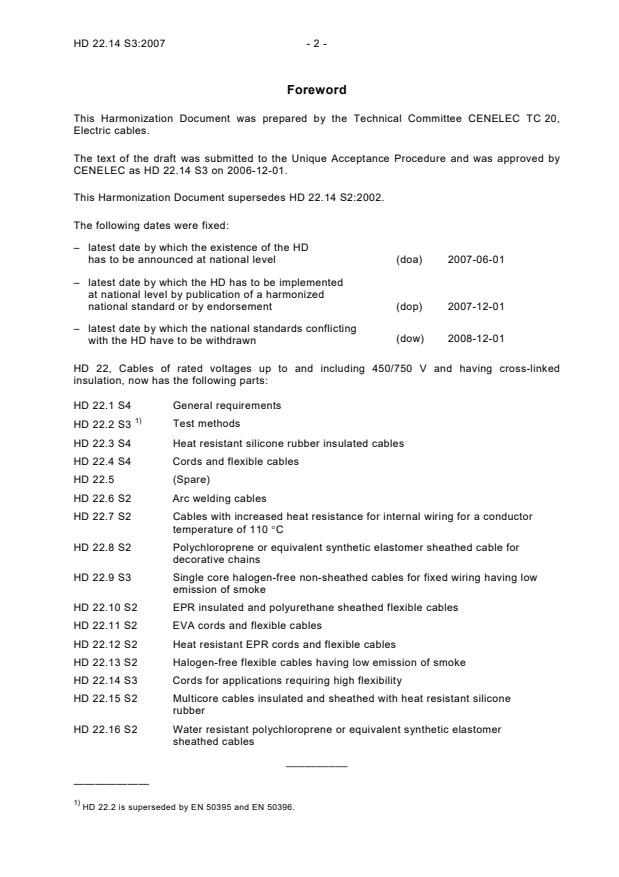 HD 22.14 S3:2007 has the following relationships with other standards: It is inter standard links to HD 22.14 S2:2002, EN 50525-2-22:2011, EN 50363-2-1:2005, EN 50363-10-1:2005, EN 50395:2005, EN 50396:2005, EN 60811-1-1:1995, EN 50363-9-1:2005, EN 50363-1:2005, EN IEC 60228:2024, EN 1648-1:2012, EN 1648-2:2012. Understanding these relationships helps ensure you are using the most current and applicable version of the standard.