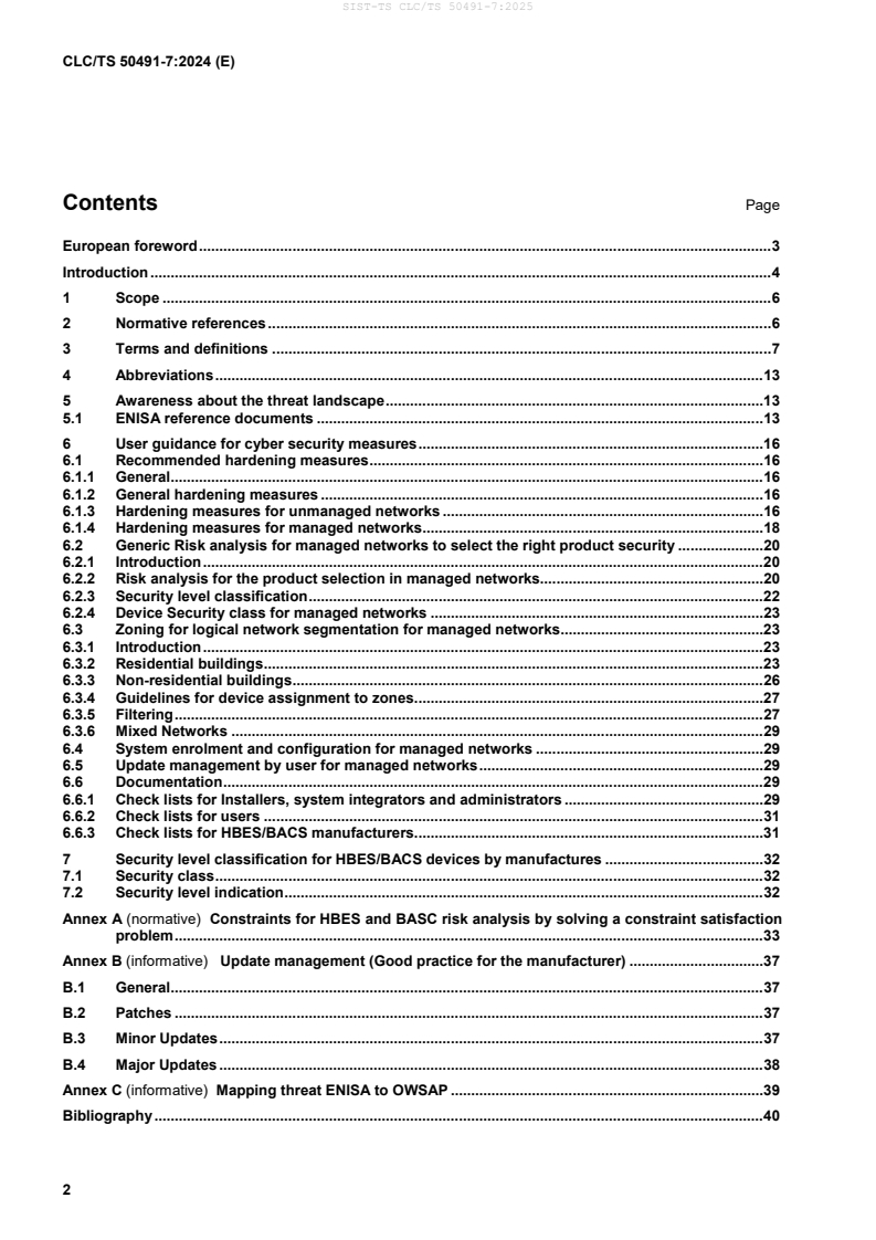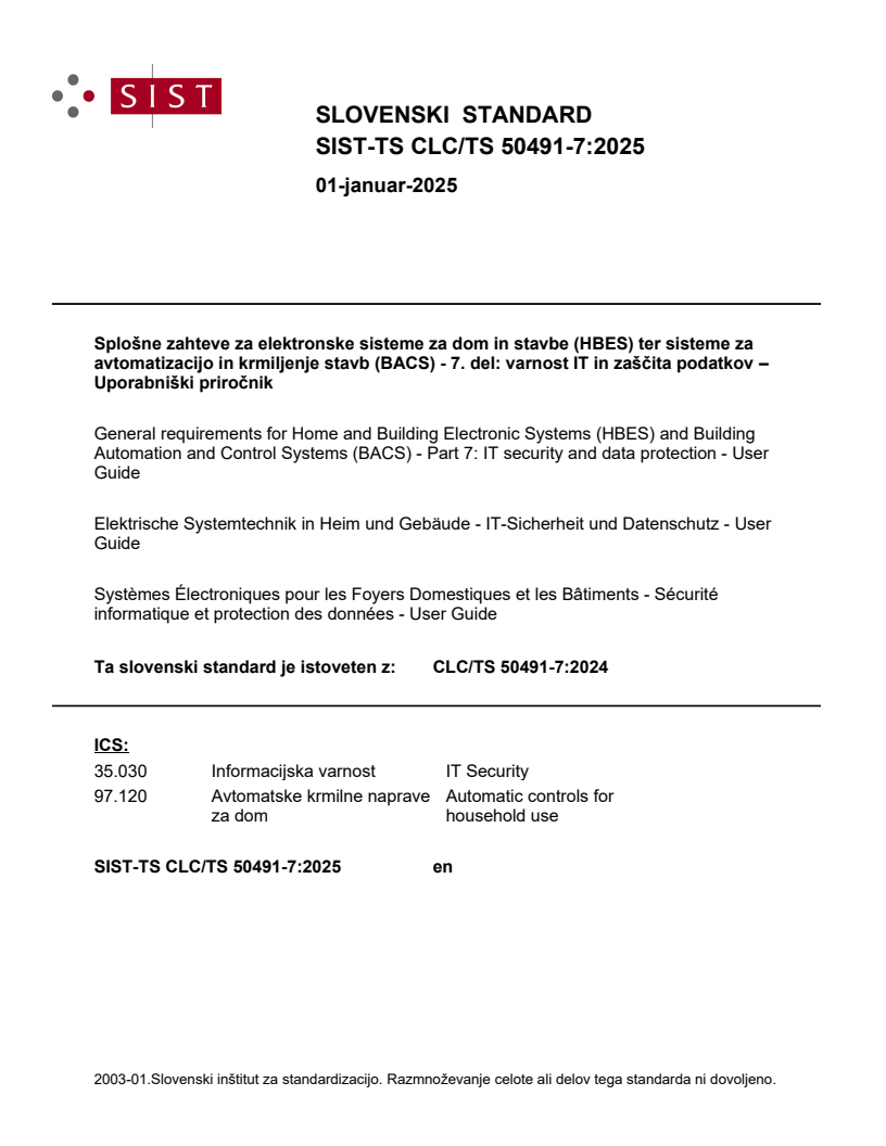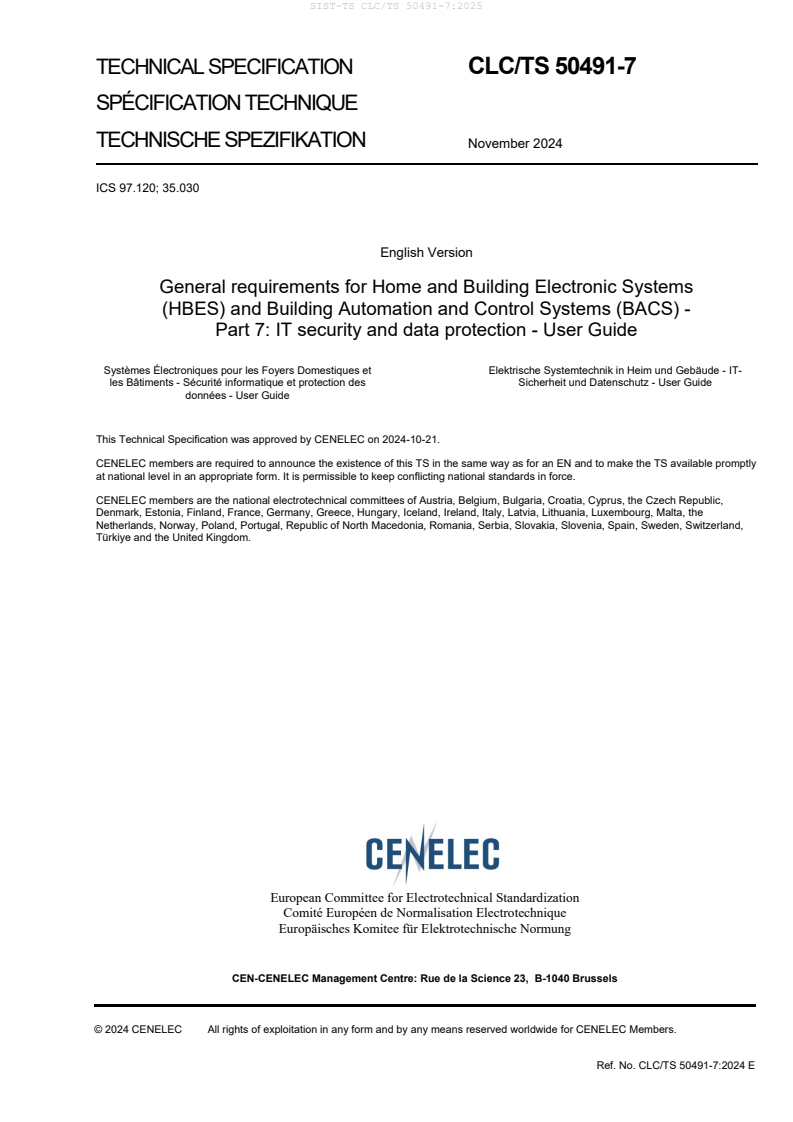 CLC/TS 50491-7:2024 - "General requirements for Home and Building Electronic Systems (HBES) and Building Automation and Control Systems (BACS) - Part 7: IT security and data protection - User Guide" is a CENELEC technical specification providing practical guidance to set up, operate and maintain cybersecure HBES/BACS connected to the Internet. It addresses lifecycle security (installation, configuration, operation, updates, end-of-life) for both small-scale (unmanaged) and larger (managed) building networks and was approved by CENELEC in 2024.