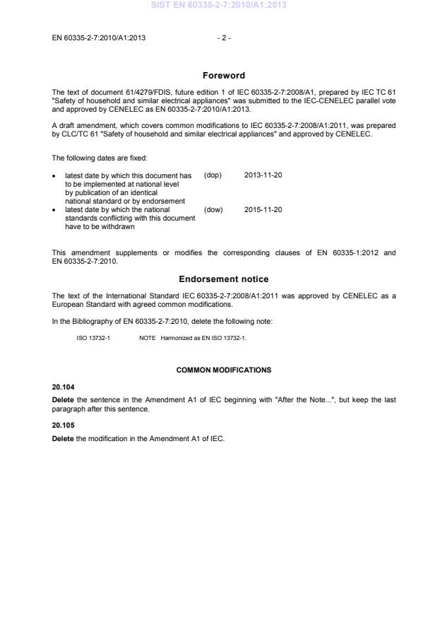 This amendment A1 modifies the European Standard EN 60335-2-7:2010; it was approved by CENELEC on