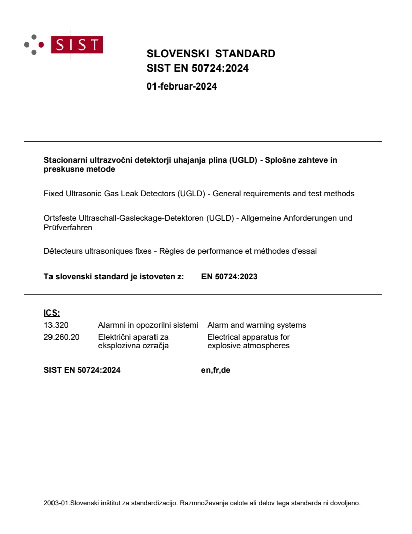 EN 50724:2023 is a standard published by CLC. Its full title is "Fixed Ultrasonic Gas Leak Detectors (UGLD) - General requirements and test methods". This standard covers: This document refers to UGLDs (ultrasonic gas leak detectors) that work in a frequency beyond the audible range. This document is applicable to fixed ultrasonic gas leak detection equipment intended to provide an indication, alarm or other output function for the purpose of initiating automatic or manual protective action(s). This document specifies general requirements for design, testing and performance, and describes test methods that apply to UGLD. The following items are considered in this document: - Leak rates to be used to verify the detection range of UGLD, - Test gas to be used (nitrogen or compressed air), - Nozzle shape and size used at all tests leak rate tests, - Gas pressure used at all leak rate tests, - Time duration of each leak rate test, - Test leak nozzle height from solid ground, - Test leak nozzle angling relative to test UGLD, - UGLD angle relative to the leak (field of coverage of the UGLD), - Wind speed and direction, air temperature and humidity at day of test, - Minimum distance to solid structures (walls, etc.) at test site, - Installation height relative to the ground, - Texture of solid ground between leak and UGLD, - Background noise sources, known to interfere with UGLDs, - Specification of detection radius in 3 dimensions, - Operational requirements such as temperature, vibration, etc. This document is also applicable when an equipment manufacturer makes any claims regarding any special features of construction or superior performance that exceed the minimum requirements of this document. This document prescribes that all such claims are verified, and that the test procedures are extended or supplemented, where necessary, to verify the claimed performance. The additional tests are agreed between the manufacturer and test laboratory and identified and described in the test report. This document does not apply to portable gas detectors using ultrasonic measurements nor to gas detectors using non-ultrasonic measurements to detect a gas leak.