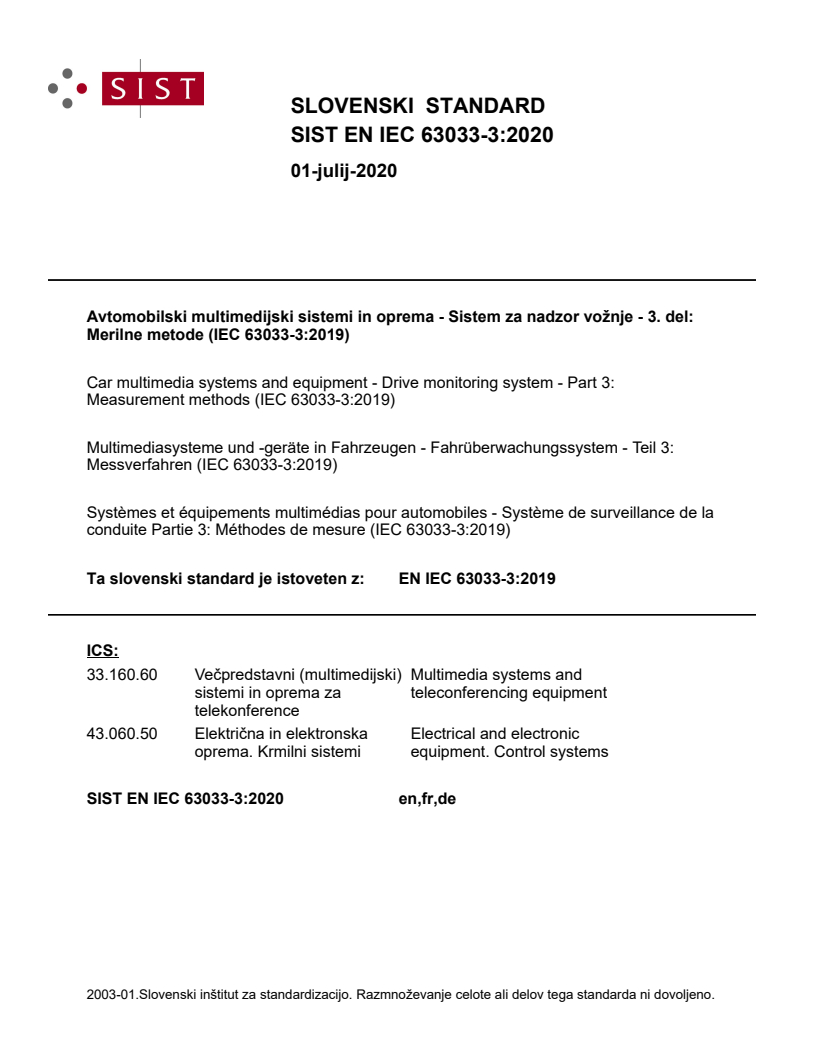 Avtomobilski multimedijski sistemi in oprema - Sistem za nadzor vožnje - 3. del: Merilne metode (IEC 63033-3:2019)