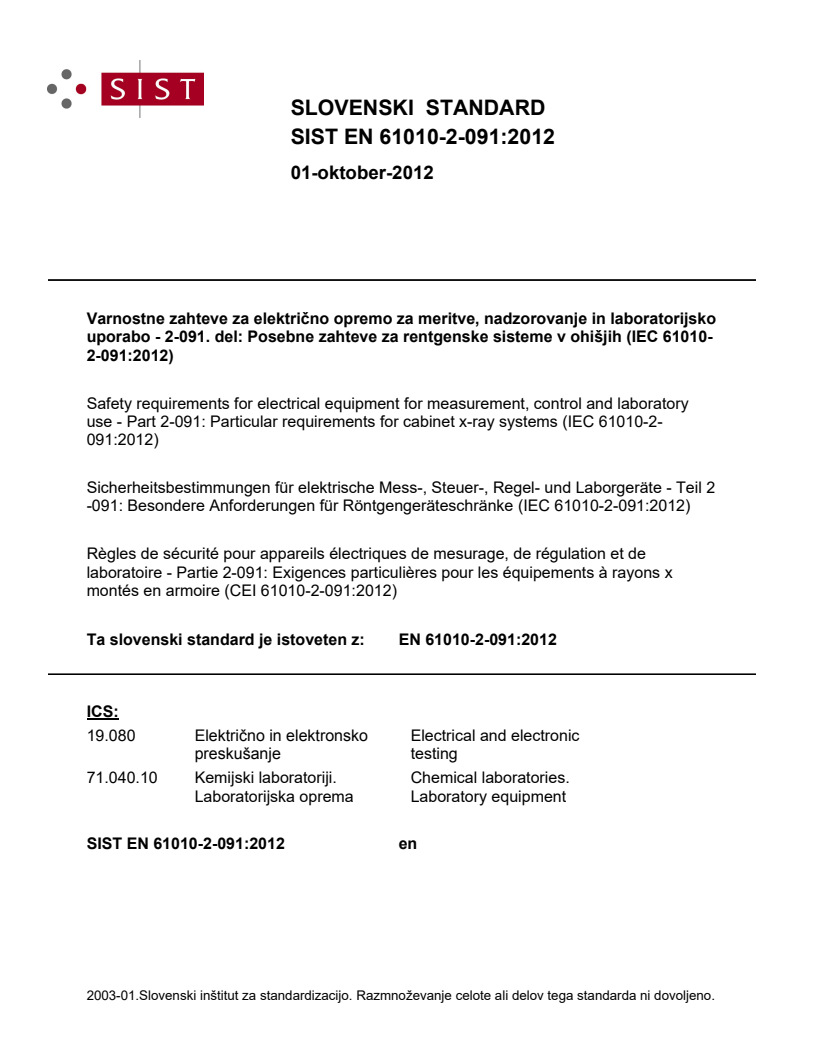 Varnostne zahteve za električno opremo za meritve, nadzorovanje in laboratorijsko uporabo - 2-091. del: Posebne zahteve za rentgenske sisteme v ohišjih (IEC 61010-2-091:2012)