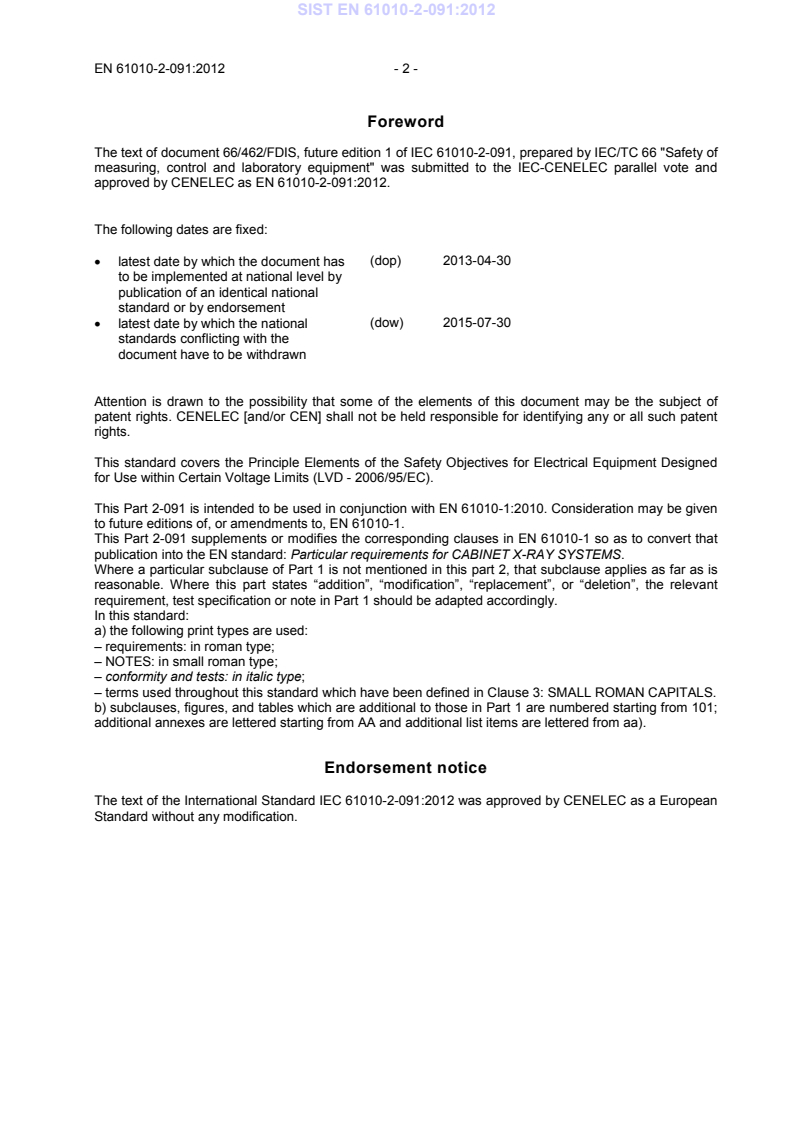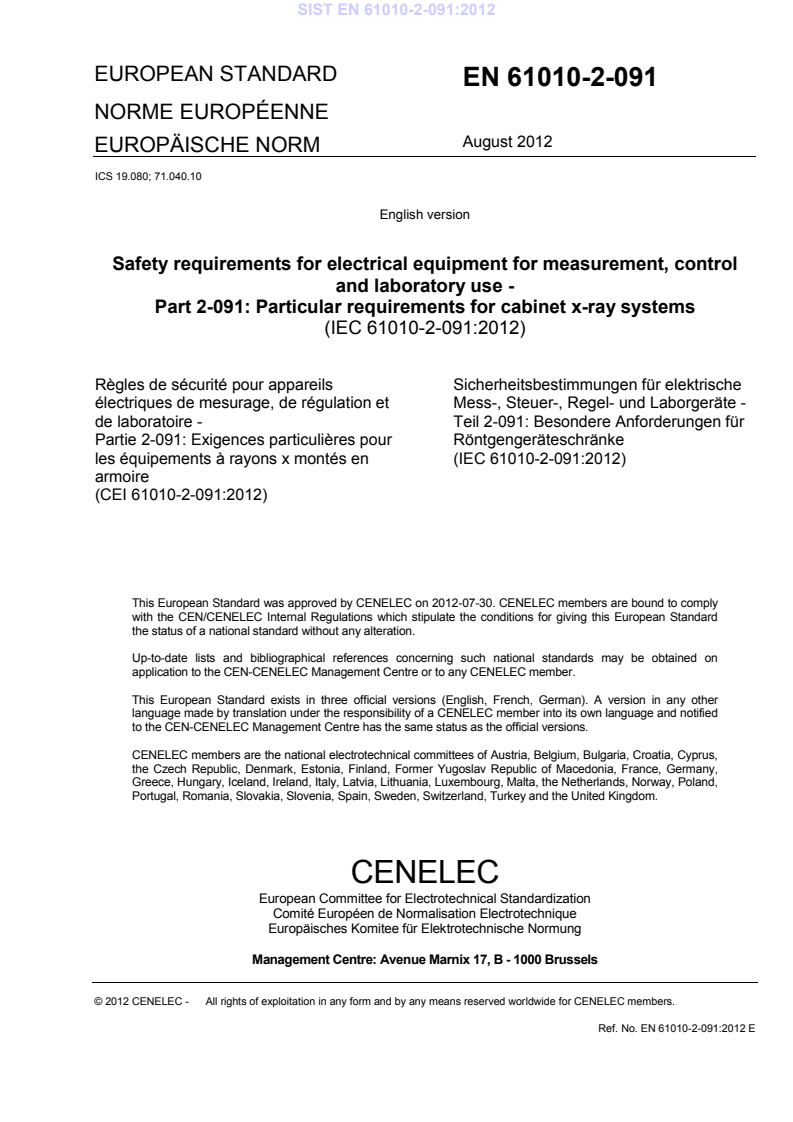 EN 61010-2-091:2012 is a standard published by CLC. Its full title is "Safety requirements for electrical equipment for measurement, control and laboratory use - Part 2-091: Particular requirements for cabinet X-ray systems". This standard covers: IEC 61010-2-091:2012 specifies particular safety requirements for CABINET X-RAY SYSTEMS. A CABINET X-RAY SYSTEM is a system that contains an X-ray tube installed in a cabinet which, independently of existing architectural structures except the floor on which it may be placed, is intended to contain at least that portion of a material being irradiated, provide radiation attenuation, and exclude personnel from the interior during generation of X-radiation. These CABINET X-RAY SYSTEMS are used in industrial, commercial, and public environments, for example, to inspect materials, to analyze materials, and to screen baggage.