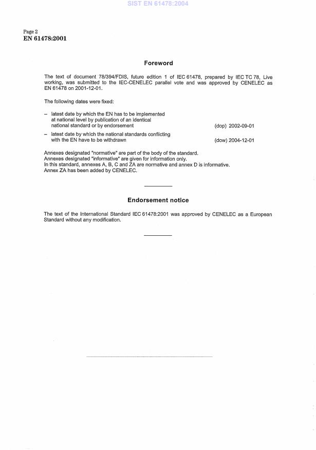 EN 61478:2001 is aligned with IEC 61478:2001. For comprehensive live working programmes, EN 61478 should be used alongside other live-working and electrical-safety standards and employer procedures covering personal protective equipment, tools and work methods.