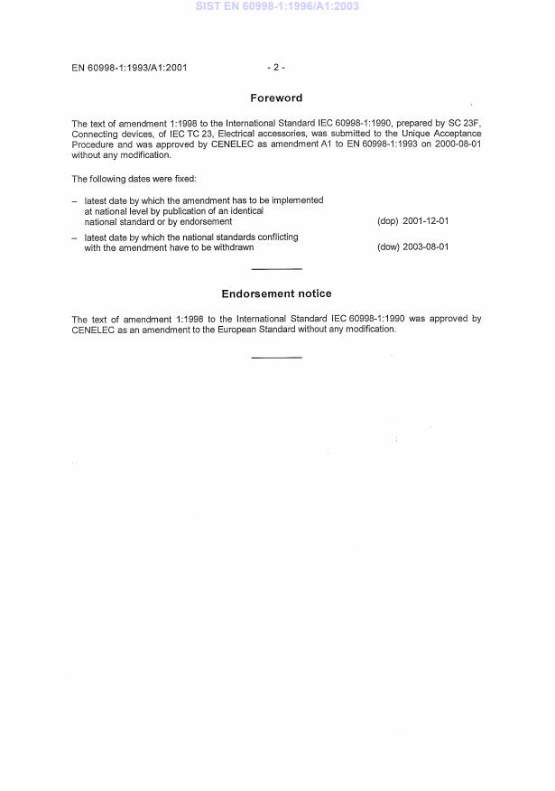 Ta slovenski standard je istoveten z: EN 60998-1:1993/A1:2001