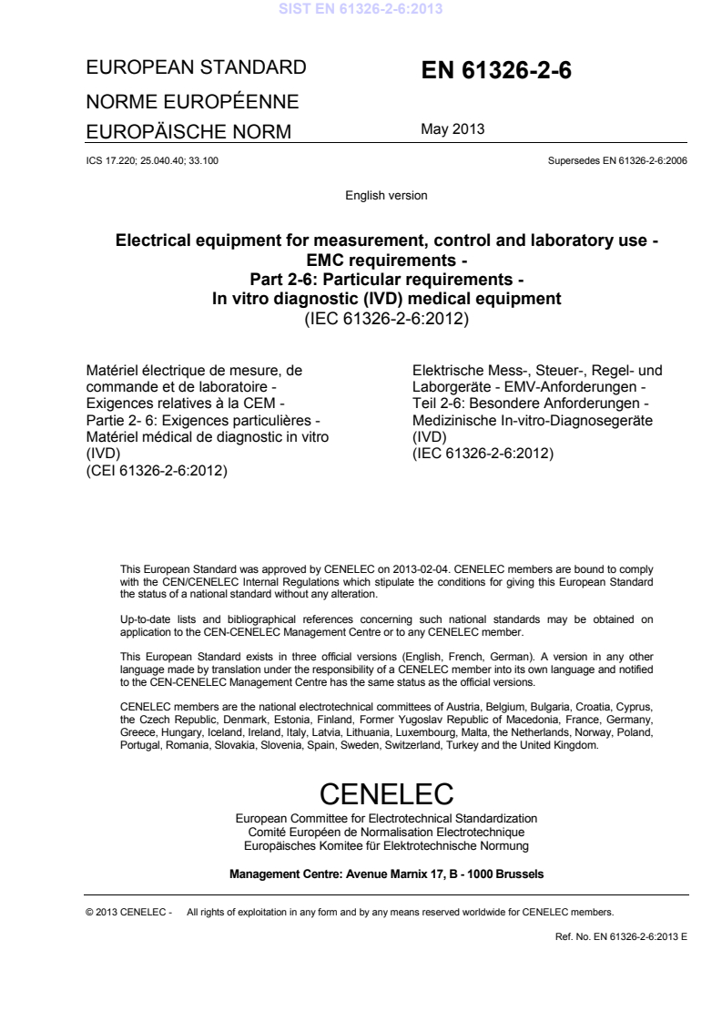 EN 61326-2-6:2013 is a standard published by CLC. Its full title is "Electrical equipment for measurement, control and laboratory use - EMC requirements - Part 2-6: Particular requirements - In vitro diagnostic (IVD) medical equipment". This standard covers: IEC 61326-2-6:2012 specifies minimum requirements for immunity and emissions regarding electromagnetic compatibility for in vitro diagnostic medical equipment, taking into account the particularities and specific aspects of this electrical equipment and their electromagnetic environment. This second edition cancels and replaces the first edition published in 2005 and constitutes a technical revision. It includes the following significant technical change: update of the document with respect to IEC 61326-1:2012.
