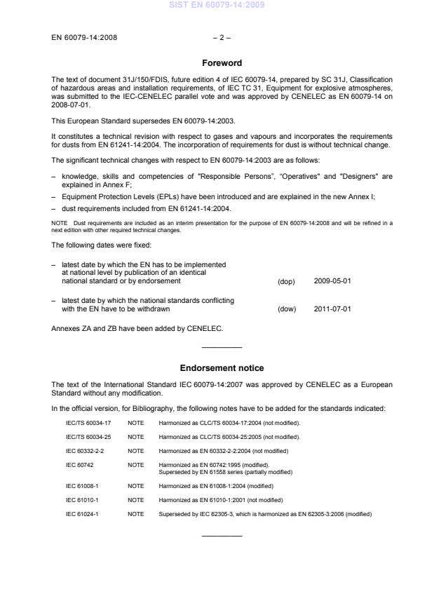 8) Attention is drawn to the Normative references cited in this publication. Use of the referenced publications is indispensable for the correct application of this publication. 9) Attention is drawn to the possibility that some of the elements of this IEC Publication may be the subject of patent rights. IEC shall not be held responsible for identifying any or all such patent rights. International Standard IEC 60079-14 has been prepared by subcommittee 31J: Classification of hazardous areas and installation requirements, of IEC technical committee 31: Equipment for explosive atmospheres. This fourth edition cancels and replaces the third edition published in 2002 and constitutes a technical revision with respect to gases and vapours and incorporates the requirements for dusts from IEC 61241-14 (2004). The incorporation of requirements for dust is without technical change. The significant technical changes with respect to the previous edition are as follows: • Knowledge, skills and competencies of "Responsible Persons”, “Operatives" and "Designers" are explained in Annex F. • Equipment Protection Levels (EPLs) have been introduced and are explained in the new Annex I. • Dust requirements included from IEC 61241-14, Ed. 1.0. SIST EN 60079-14:2009