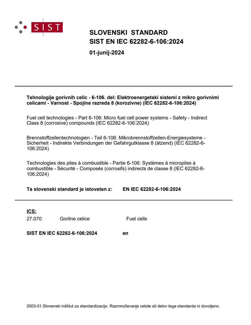 Tehnologije gorivnih celic - 6-106. del: Elektroenergetski sistemi z mikro gorivnimi celicami - Varnost - Spojine razreda 8 (korozivne) (IEC 62282-6-106:2024)