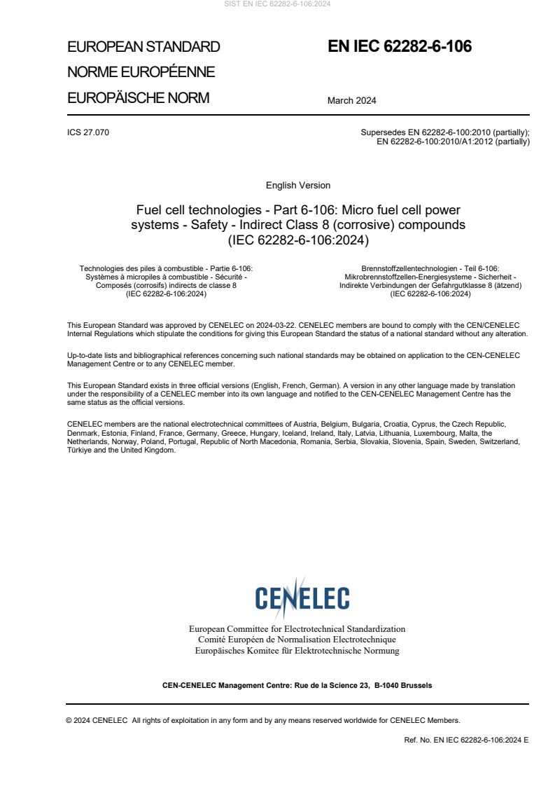 EN IEC 62282-6-106:2024 (IEC 62282-6-106:2024) is a safety standard for micro fuel cell power systems that generate hydrogen from UN Class 8 (corrosive) borohydride formulations. It applies to micro fuel cell power systems, micro fuel cell power units and fuel cartridges that use proton exchange membrane (PEM) fuel cell technologies and include fuel-processing subsystems to derive hydrogen from corrosive borohydride fuels. This first edition is part of the IEC 62282-6-1XX series and replaces parts of the earlier IEC 62282-6-100:2010 series. It is intended to be used in conjunction with IEC 62282-6-101:2024 (general safety requirements).