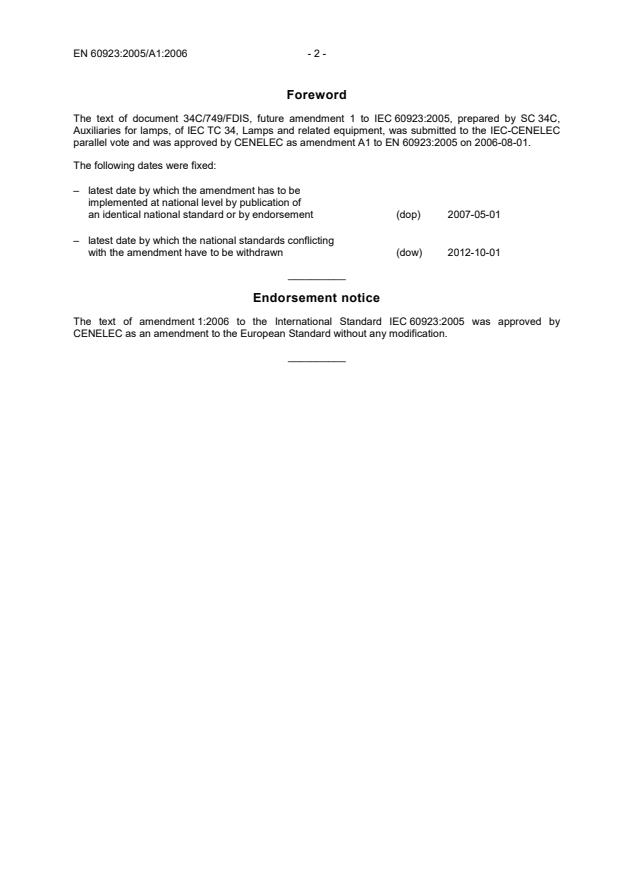 This amendment A1 modifies the European Standard EN 60923:2005; it was approved by CENELEC on