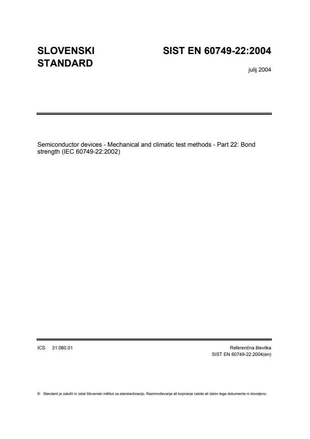 EN 60749-22:2003 (adopted from IEC 60749-22:2002) is a European test-method standard for measuring bond strength of semiconductor devices - both discrete devices and integrated circuits. Its objective is to provide repeatable mechanical tests to measure or verify compliance with specified bond strength requirements for wire bonds, die bonds and other electrical connections inside and external to packages.