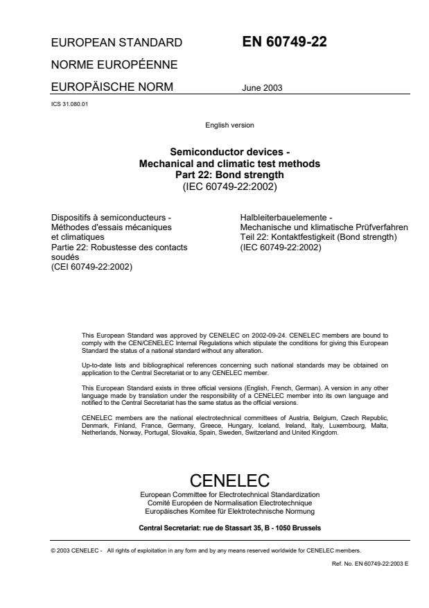 EN 60749-22:2003 is a standard published by CLC. Its full title is "Semiconductor devices - Mechanical and climatic test methods - Part 22: Bond strength". This standard covers: Applicable to semiconductor devices (discrete devices and integrated circuits), this test measures bond strength or determine compliance with specified bond strength requirements