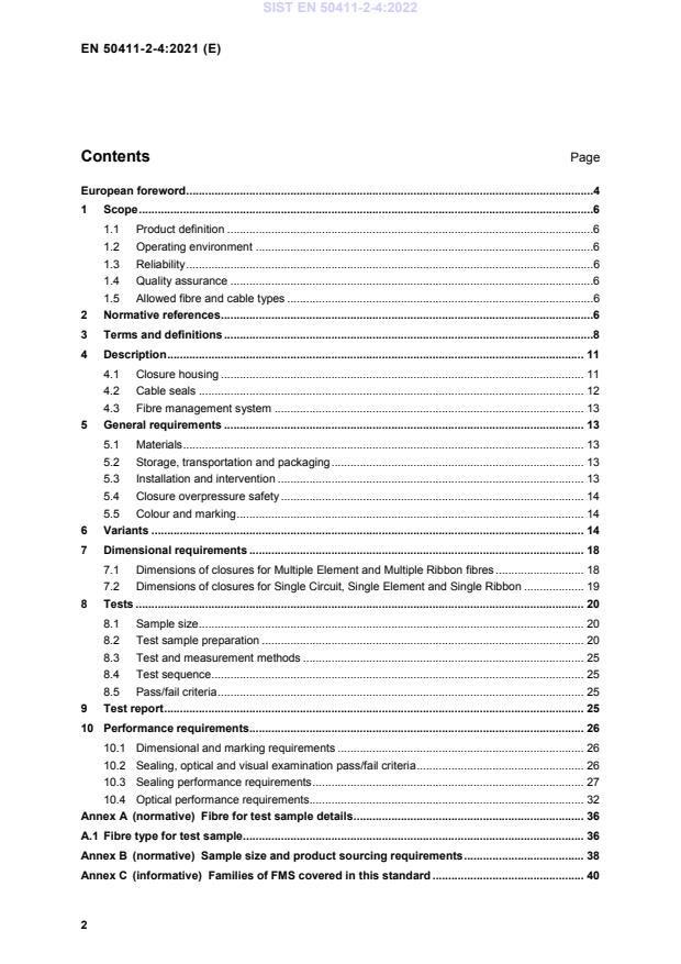 EN 50411-2-4:2021 is a standard published by CLC. Its full title is "Fibre management systems and protective housings to be used in optical fibre communication systems - Product specifications - Part 2-4: Sealed dome fibre splice closures for category S & A". This standard covers: 1.1 Product definition This document contains the initial, start of life dimensional, optical, mechanical and environmental performance requirements of a fully installed splice closure in order for it to be categorized as a European Standard product. 1.2 Operating environment The tests selected combined with the severity and duration are representative of an outside plant for subterranean and/or aerial environments defined by: EN IEC 61753 1 category S: subterranean environment category A: aerial environment 1.3 Reliability Whilst the anticipated service life expectancy of the product in this environment is 20 years, compliance with this specification does not guarantee the reliability of the product. This is predicted using a recognized reliability assessment programme. 1.4 Quality assurance Compliance with this specification does not guarantee the manufacturing consistency of the product. This is maintained using a recognized quality assurance programme. 1.5 Allowed fibre and cable types This closure standard allows both single-mode and multi-mode fibre to be used and covers all IEC standard optical fibre cables with their various fibre capacities, types and designs. This includes, but is not limited to, optical fibre cable standards EN 60794 2 (indoor) and EN 60794 3 (outdoor). The optical performance tests are carried out on test samples with EN IEC 60793 2 50 single-mode fibre (see Annex A). The selected fibre type for the optical test samples depends on the design of the fibre management system.