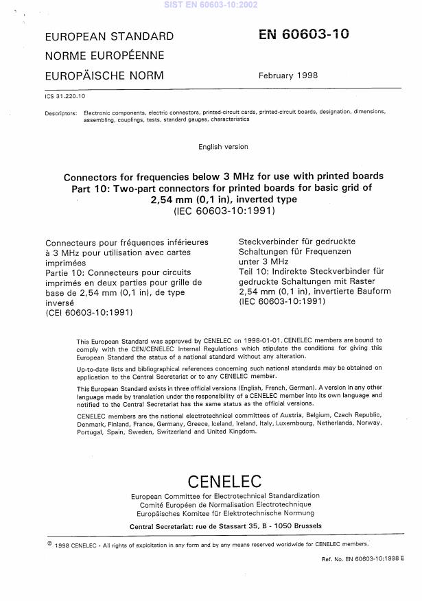 EN 60603-10:1998 is a standard published by CLC. Its full title is "Connectors for frequencies below 3 MHz for use with printed boards - Part 10: Two-part connectors for printed boards for basic grid of 2,54 mm (0,1 in), inverted type". This standard covers: Describes a group of related two-part connectors for printed boards, with 32, 48, 64 and 96 contacts for low-voltage applications.