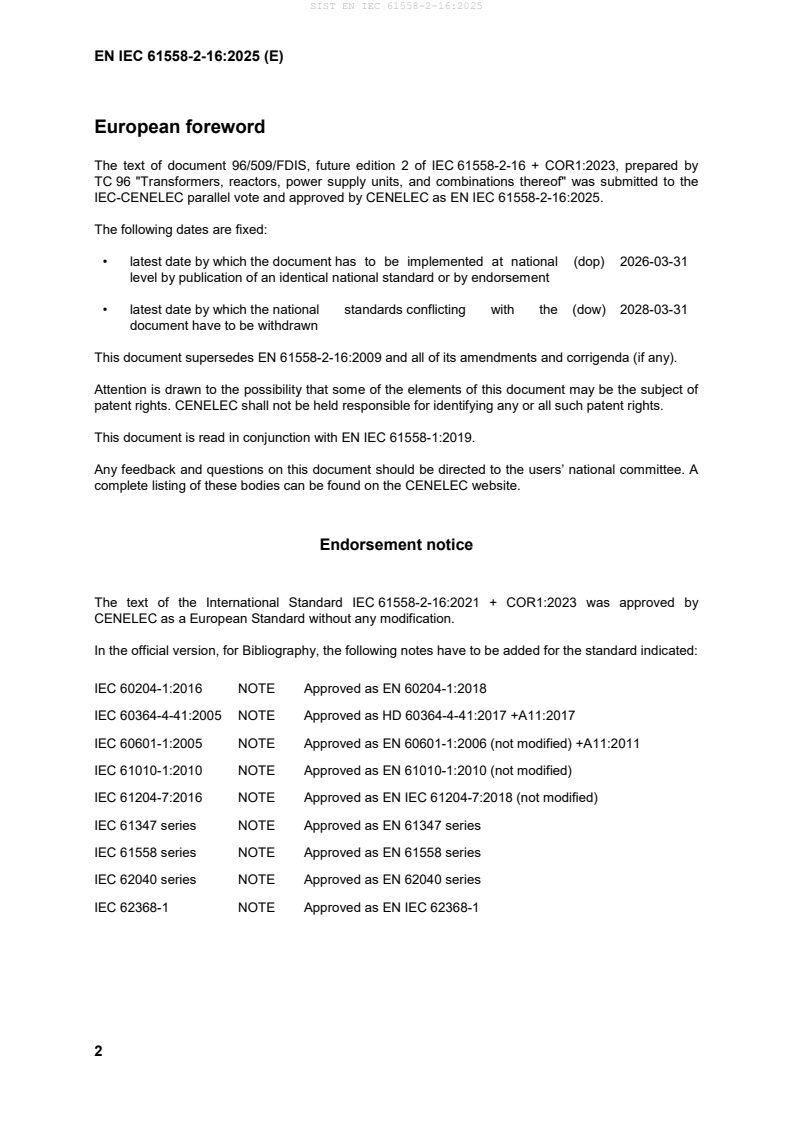 EN IEC 61558-2-16:2025 is a standard published by CLC. Its full title is "Safety of transformers, reactors, power supply units and combinations thereof - Part 2-16: Particular requirements and tests for switch mode power supply units and transformers for switch mode power supply units for general applications". This standard covers: This part of IEC 61558 deals with the safety of switch mode power supply units and transformers for switch mode power supply units. NOTE 1 Safety includes electrical, thermal and mechanical aspects. Unless otherwise specified, from here onward, the term SMPS covers switch mode power supply units for general applications. SMPS covered by this document are air cooled (natural or forced) independent, associated, stationary, portable, single-phase or polyphase with the rated supply voltage not exceeding 1 000 V AC, the rated supply frequency not exceeding 500 Hz, the rated internal operating frequency exceeding 500 Hz, but not exceeding 100 MHz, and the rated output not exceeding 1 kVA or 1 kW, incorporating dry-type transformers with encapsulated or non-encapsulated windings. NOTE 2 As the maximum rated supply voltage of the internal transformer is 1 000 V AC, the maximum rated supply voltage of the switch mode power supply unit can be lower due to the type of rectification. NOTE 3 For higher frequencies, additional requirements can be necessary. However, this document can be used for guidance. This document is applicable to SMPS, converters and inverters without limitation of the rated output subject to an agreement between the purchaser and the manufacturer. NOTE 4 In the context of this document, converters and inverters are considered to be SMPS. This document applies to: a) SMPS incorporating safety isolating transformers providing SELV, PELV, AC or DC output voltage(s) or a combination thereof in accordance with IEC 61140 and IEC 60364-4-41 for use with household and other consumer products, b) SMPS with a maximum output voltage not exceeding 1 000 V AC or 1 415 V ripple-free DC for use with household and other consumer products, except for products covered in a), c) This document can be used for transformers for use in SMPS (see Annex BB). This document does not apply to: - motor-generator sets; - uninterruptible power supplies (UPS) in accordance with the IEC 62040 series; - SMPS covered by IEC 61204-7 (i.e. low-voltage power supply devices DC output, performance characteristics) and DC power and distribution equipment and SMPS for use in applications covered by IEC 61010-1 and IEC 60601-1; - lamp control gear covered by the IEC 61347 series; - external circuits and their components intended to be connected to the input terminals and output terminals of the SMPS; - equipment in accordance with IEC 60065, IEC 60950-1 and IEC 62368-1. This document can also be used for guidance for products not covered by the scope of this document, the scope of IEC 61204-7 or the scope of the IEC 61347 series. This document covers the safety requirements for: [...]